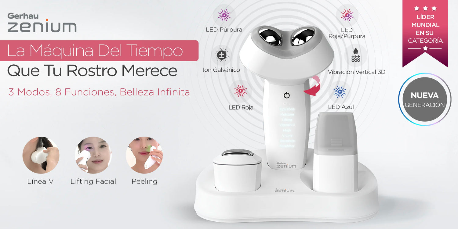 Gerhau Zenium es un dispositivo de belleza de nueva generación equipado con tecnología ultrasónica, corriente galvánica, vibración vertical 3D y terapia con luz LED.
