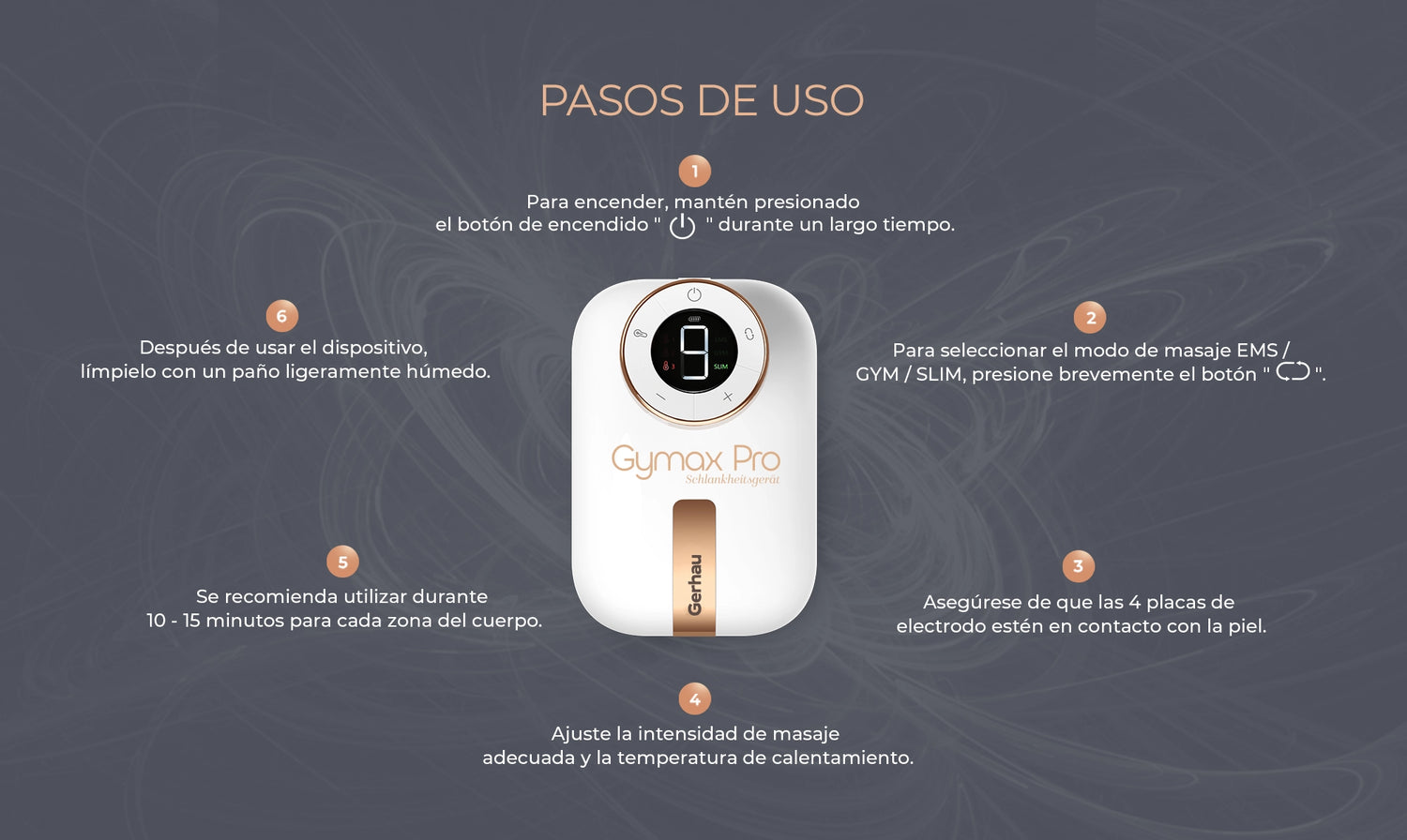 Úsalo una vez por la mañana y una vez por la noche, durante 10-15 minutos cada vez. Puedes usarlo de 3 a 4 días a la semana. Tomar al menos 1 día de descanso entre usos potenciará aún más los efectos de Gymax Pro. Usar el dispositivo de forma continua todos los días no aumenta su efectividad, sino que la disminuye.