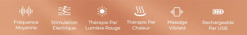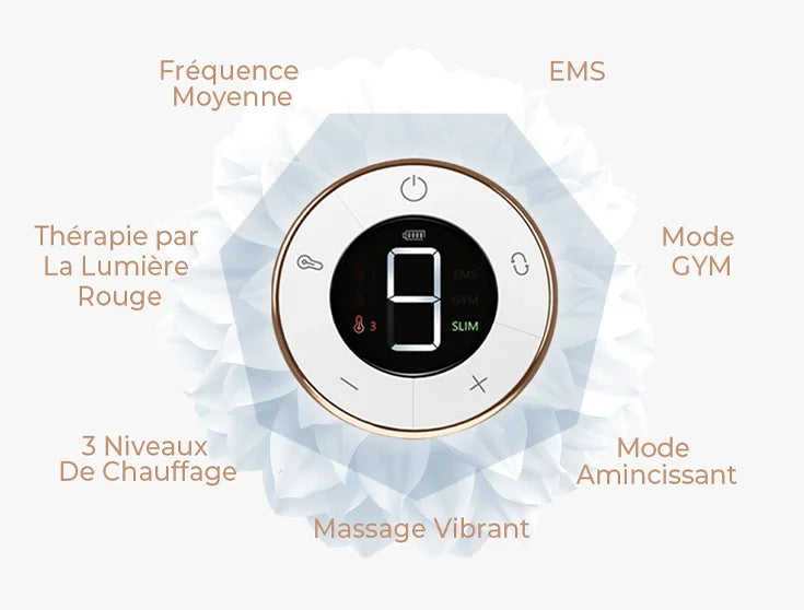 Le produit dispose de 3 niveaux de chauffage : (niveau 1, niveau 2, niveau 3). La plage de température est d’environ 42 à 52 °C. L’application de chaleur a généralement pour effet de dilater les vaisseaux sanguins, d’améliorer la circulation sanguine et d’accélérer le métabolisme, procurant ainsi des bienfaits spécifiques au corps. Elle peut être utilisée en combinaison avec les modes EMS, SLIM et GYM.