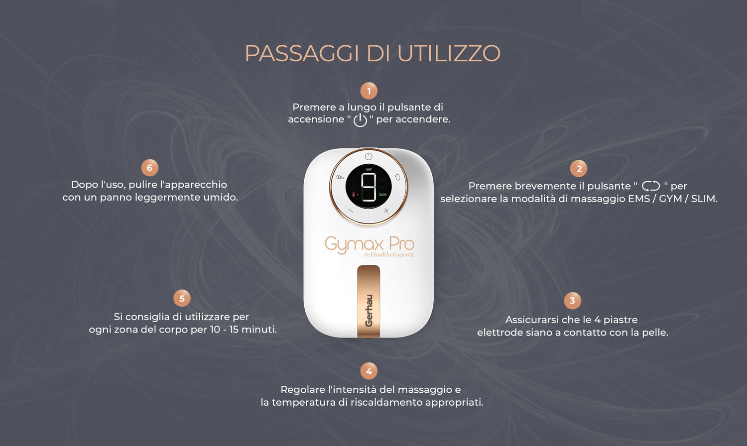 Utilizzare la fascia speciale per la vita e il braccio inclusa con il Gerhau Gymax Pro, soprattutto nelle zone dell’addome, delle gambe e dei fianchi, renderà l’uso del dispositivo più semplice. Se prevedi di eseguire il trattamento per un periodo prolungato o di svolgere altre attività durante l’uso, fissa il dispositivo sotto la copertura speciale della fascia. Mantenere il dispositivo nella stessa posizione per troppo tempo può causare arrossamenti o irritazioni. Per questo motivo, si consiglia di cambiare posizione del dispositivo sul corpo a intervalli regolari.