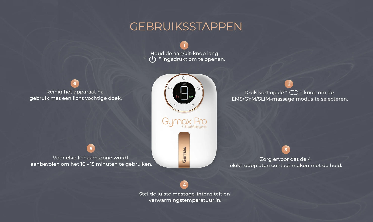 Gebruik het één keer 's ochtends en één keer 's avonds, telkens 10–15 minuten. U kunt het 3 tot 4 dagen per week gebruiken. Minstens 1 dag pauze tussen de toepassingen nemen, zal de effectiviteit van Gymax Pro verder vergroten. Het apparaat elke dag zonder onderbreking gebruiken verhoogt de effectiviteit niet, maar verlaagt deze juist.