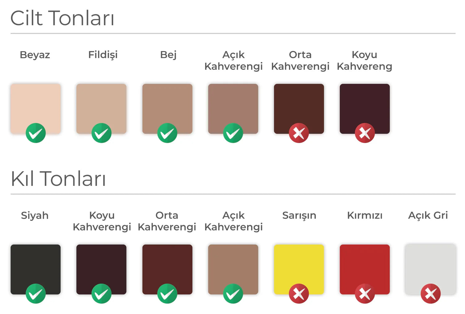 IPL epilasyon sistemi yalnızca açık ila orta cilt tonları üzerine uygulanmak için tasarlanmıştır. Cihazın koyu cilt tonlarında KESİNLİKLE KULLANILMAMASI tavsiye edilir. IPL ışınları koyu ve açık tondaki siyah ve kahverengi kıllar üzerinde etkilidir. Sarı, kırmızı, beyaz ve gri kıllar üzerinde herhangi bir etkisi yoktur. Kullanımdan önce mutlaka uygun cilt tonu ve kıl tonlarını kontrol ediniz.